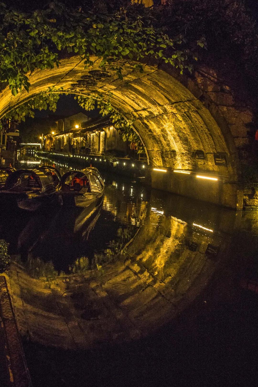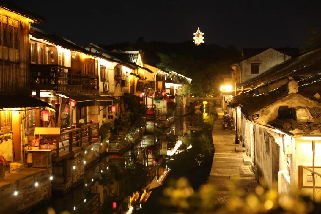 微風(fēng)簇浪,漣漪絲絲,在燈光的映襯下,層層漣漪變得五光十色,倒映在小橋流水之上,或明或暗的老街有一種夢幻旖旎之美,宛若在江南的天堂里,令人沉醉。