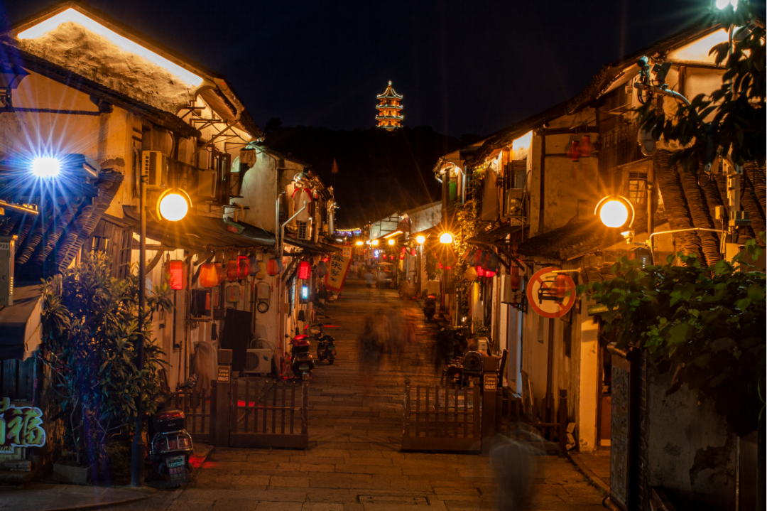避開了白日的喧鬧,踏著青石板路,走過水鄉(xiāng)橋頭,漫步于璀璨的夜景中,使人更能感受到夜色下江南的古街風(fēng)韻。
