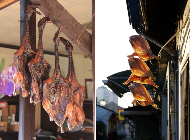 每到冬日,有手藝的老紹興人就開(kāi)啟醬貨日程,晾衣竿成了晾醬貨的專(zhuān)用,有太陽(yáng)的角落都成為醬貨的主場(chǎng)。