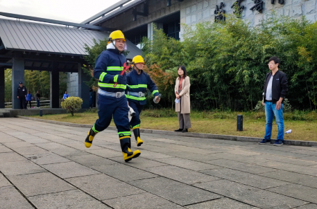 為確保景區在遇到突發火災時,能在最短時間內充分發揮消防安全保障機制作用,快速、高效、有序地實施滅火工作,防止人員傷亡和最大限度地減輕財產損失,進一步普及消防安全知識,增強員工消防安全意識,結合消防宣傳月各項活動,11月17日下午,蘭亭景區在書法博物館廣場組織全體職工和安保人員進行了一次消防安全實戰演練。