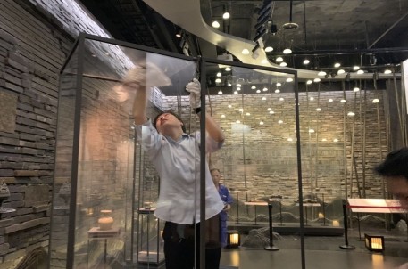 為了給游客創造一個更加干凈、整潔的觀賞環境,蘭亭書法博物館陳列保管部借著2020年7月6日周一閉館之際,對基本陳列廳展柜進行了衛生清潔以及展品小標簽更換工作。 為使清潔工作更加順利、高效,工作人員進行了分工合作,有套上鞋套、拿著清潔工具進入展柜中清潔的,有負責引導的。由于空間狹小,工作人員先將展品移出展柜,在對展柜玻璃進行清潔的同時也對展面與展臺進行打掃。這一過程中,總會有沒有清潔到的地方或死角,站在展柜外的人員就及時對里面的人進行提醒與引導,使清潔工作進行地更加全面與徹底。完成展柜玻璃及展臺的除塵清理工作后,工作人員還對個別展品的小標簽進行了更換調整,以使標簽樣式統一、美觀。 對博物館基本陳列廳進行的衛生清潔及展品小標簽更換,不僅使展覽環境煥然一新,也為游客創造了更加整潔、舒心的參觀環境。 文/程一高 圖/陳舸 |