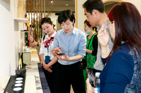 考察團在博物館領導的陪同與講解員的引領下參觀了蘭亭書法博物館。由于臨沂是書圣王羲之的出生之地,故考察團著重參觀了基本陳列“一日千載”,并就和此展相關的展覽設計、文本內容、展品來源等方面與博物館陪同人員進行了交流。上午11點,一行人來到會議室,由蘭亭書法博物館陳列保管部負責人向他們介紹了博物館基本陳列、開館至今的臨展以及巡展的詳細情況。雙方針對博物館概況、展陳策劃、空間利用、展覽走進高校等內容進行了分享、溝通,氛圍友好而熱烈,在共同探討中獲益匪淺。