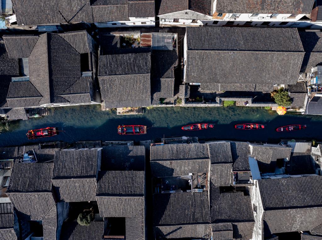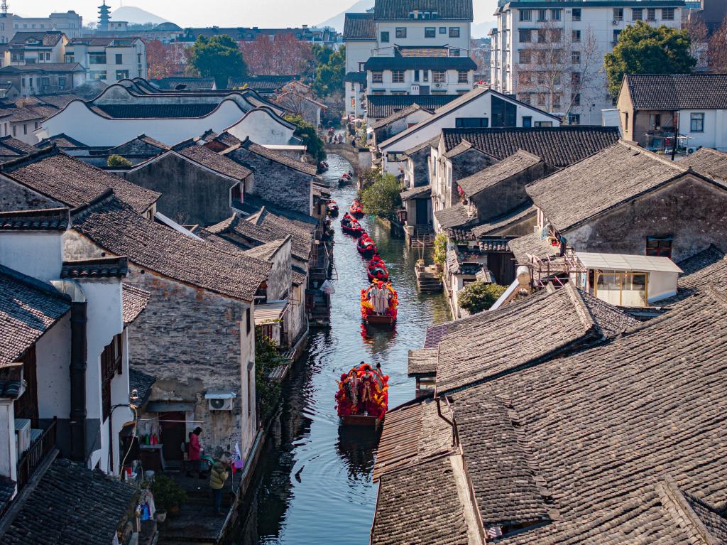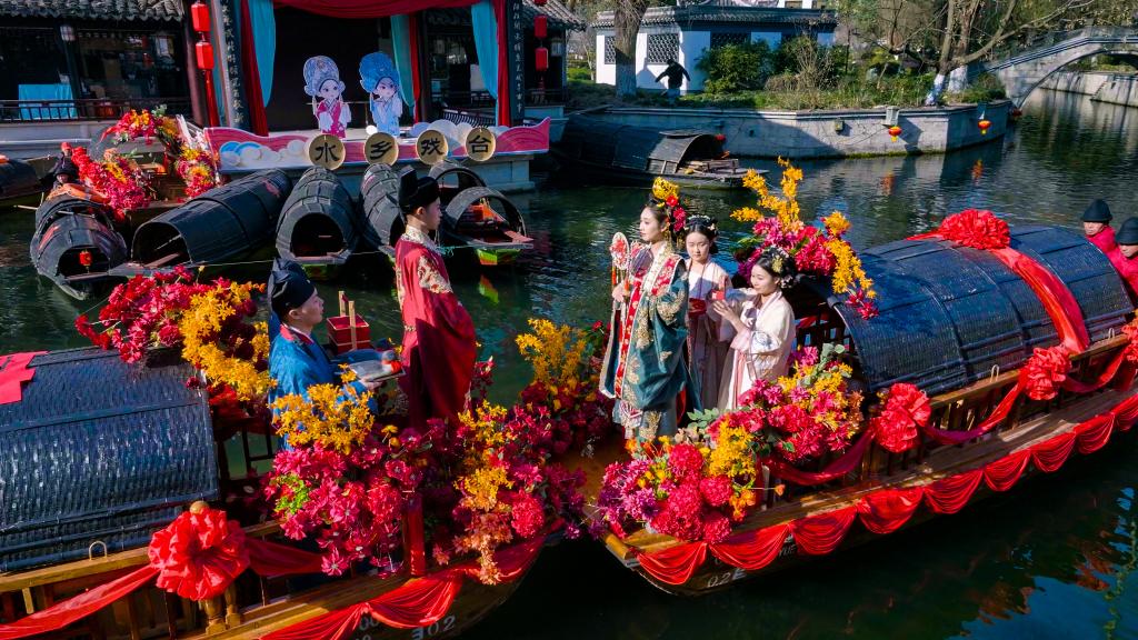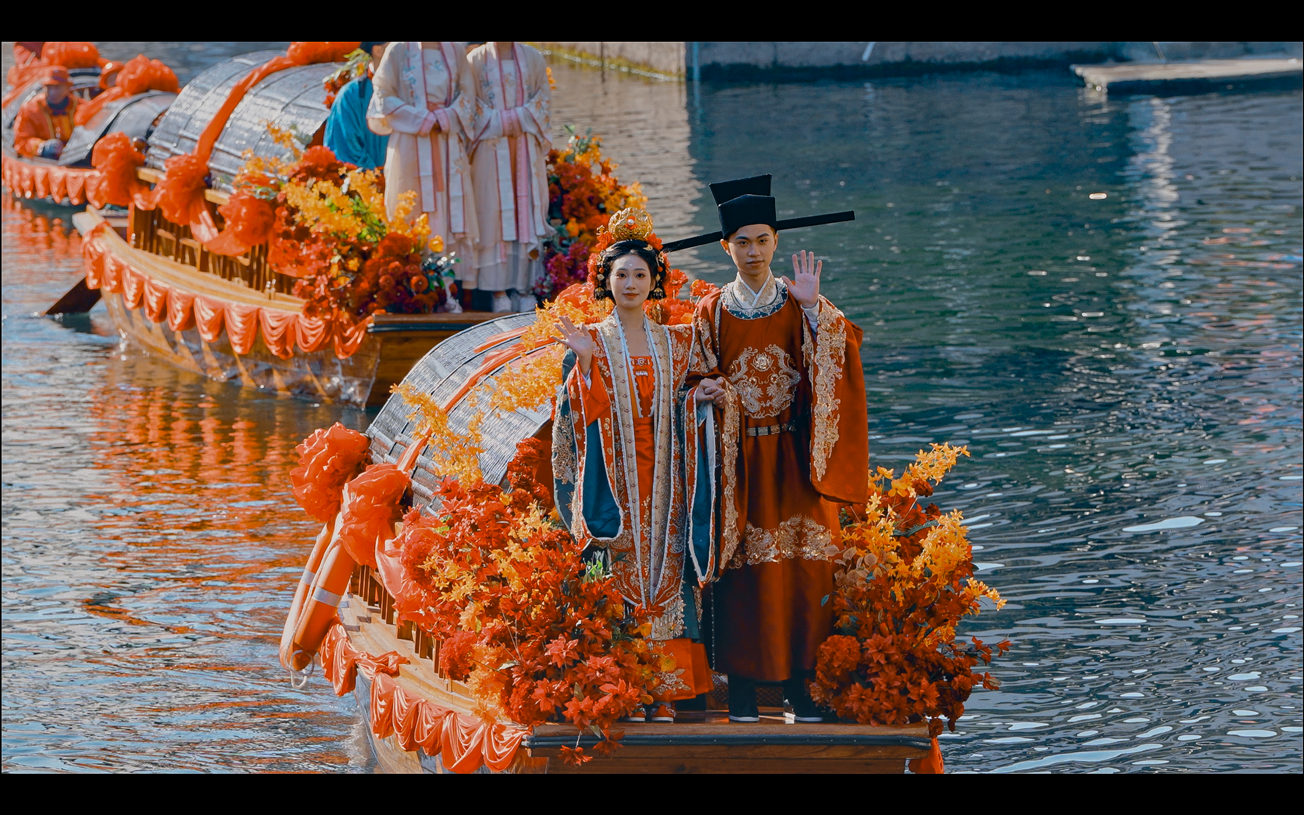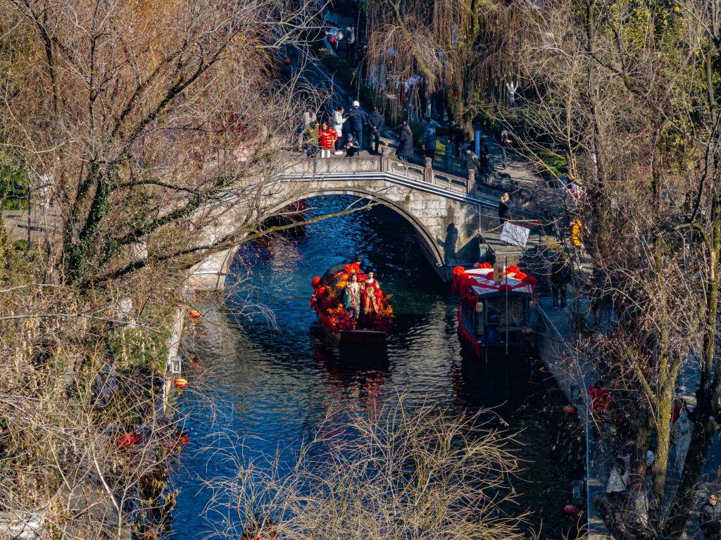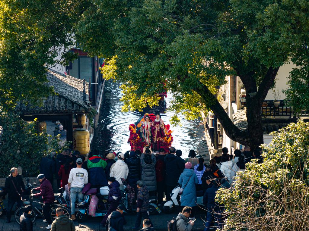 在城市廣場水域,開啟一場老紹興水上迎親巡游,伴隨著熱鬧的鑼鼓、喜慶的嗩吶,新人攜手一起跨火盆、過馬鞍、挑蓋頭、拜天地、許誓言,向大家分撒喜糖。在鼓樂聲中,一對新人坐著烏篷水上巡游,將浪漫演繹到極致。圍觀群眾可以加入迎親的船隊,沾沾新人喜氣。新人在眾人的祝福中完成一場傳統水上婚禮,攜手開啟幸福人生。
