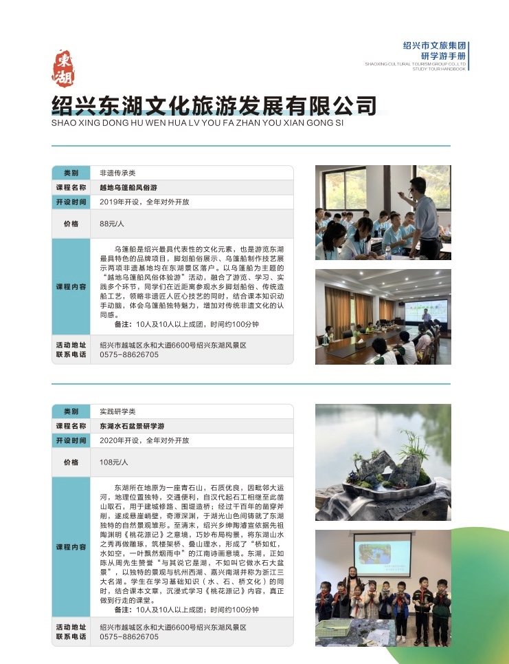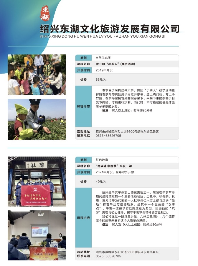 東湖不僅風光旖旎,更有著深厚的人文底蘊。東湖主人陶濬宣在 東湖建園之時,因“激于國恥,抱憂食患,奮不顧家,思為天下育才,為廟廊儲才,積歷歲脩(修)脯,縮食損衣,毀產負債,獨力捐建”創立了東湖通藝學堂,引入西式教育,開設史學、算學、經學、譯學等新式學科,建立稷廬藏書樓為學生提供書籍閱覽,引領當時的進步青年們獲得更多新知。1909 年通藝學堂更名為“紹興私立法政學堂”,是中國最早出現的兩所私立法政學堂之一,在當時相比傳統私塾教育更有時代特征和文化先進性。東湖通藝學堂曾聘請陶成章、壽孝天、周作人等越中名士為師,我國著名氣象學家竺可楨、詩人劉大白、愛國將領陳儀曾就讀于此。 東湖研學游依據東湖獨特的自然環境和歷史人文底蘊,開設5大類課程:非遺傳承類——越地烏篷船風俗游、實踐研學類——東湖水石盆景研學游、自然生態類——做一回“小茶人”(季節活動)、紅色教育——“民族魂 中國夢”辛亥一課、黨建教育/清廉家風教育。