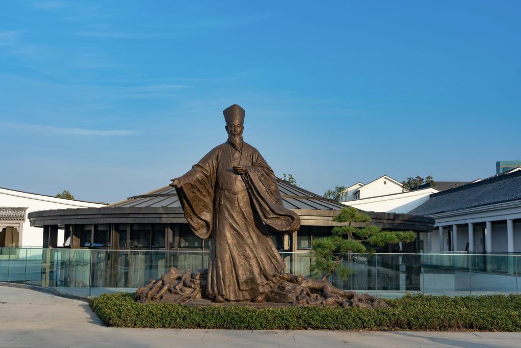 王陽明雕像位于王陽明紀念館前,高4.5米,由中央美術學院教授、中央美術學院理事會副理事長孫偉教授團隊創作。該尊雕像呈現的是王陽明先生講學的狀態,展現了陽明先生作為一代宗師的莊重內斂,又傳遞出其誨人不倦的親和氣質,完美呈現了這位心學大師“知行合一”的精神境界。