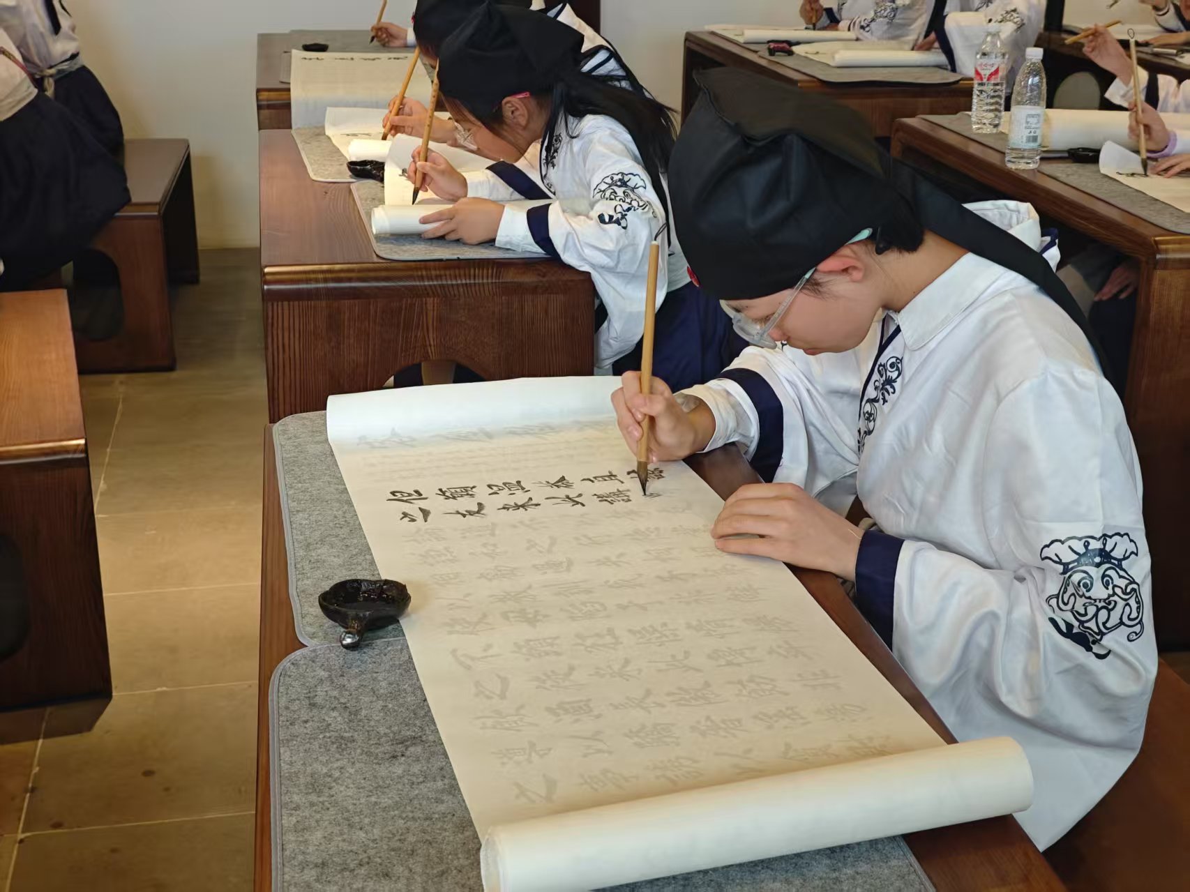 《客座私祝》是王陽明先生奉命征剿叛亂之際,對其子弟及來訪客人的殷切期望與告誡,強調了擇友之道、道德修養及家庭教育的重要性;同時也是先生為數不多留存于世的紙本楷書作品,展示了其精美的書法藝術。陽明故里特此推出“探墨《客座私?!?感悟先圣教誨”研學游課程,旨在引領學生們穿越時空,聆聽陽明先圣的教誨,從中汲取智慧與力量,培養青少年正確的價值觀和道德觀念。