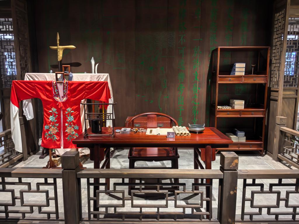 展廳模擬徐渭創作戲本所用的書房一景,旁置明代風格形制的戲服,生動還原當時的場景。徐渭自稱“南腔北調人”,他在戲曲上的成就非常突出,創作了不拘一格、抒懷寫憤的雜劇《四聲猿》,掀起了明中后期雜劇創作的高潮;研究“士夫罕有留意”的宋元南戲,留下了中國古代戲曲史上唯一的一部南戲概括性著作《南詞敘錄》。