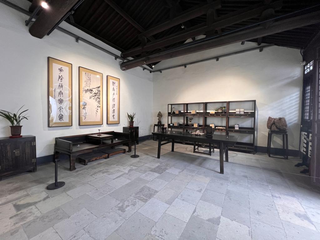 前門上方的匾額“灑翰齋”為徐渭手跡,他青少年在此習(xí)書作畫。墻面掛著《墨葡萄圖》,水墨淋漓,使中國(guó)畫的特征得到了充分的表現(xiàn),同時(shí)圖上所題詩(shī)句“筆底明珠無(wú)處賣,閑拋閑擲野藤中”,更使人強(qiáng)烈地感受到他縱情但又不愿馴服的內(nèi)心世界。兩側(cè)有吳昌碩篆書七言聯(lián)“樹角夕陽(yáng)歸邋馬,花陰微雨寫來(lái)禽。仲清仁兄正譌,安吉吳俊卿”。室內(nèi)陳列了畫案,文房四寶,明式書柜兼博古架,架上有仿古線裝書及仿明代瓷雜若干。北墻懸掛了蒙古刀,生動(dòng)形象地還原了明代晚期江南文人的生活習(xí)慣與起居環(huán)境,一字一文也與徐渭的生活和經(jīng)歷相關(guān)。