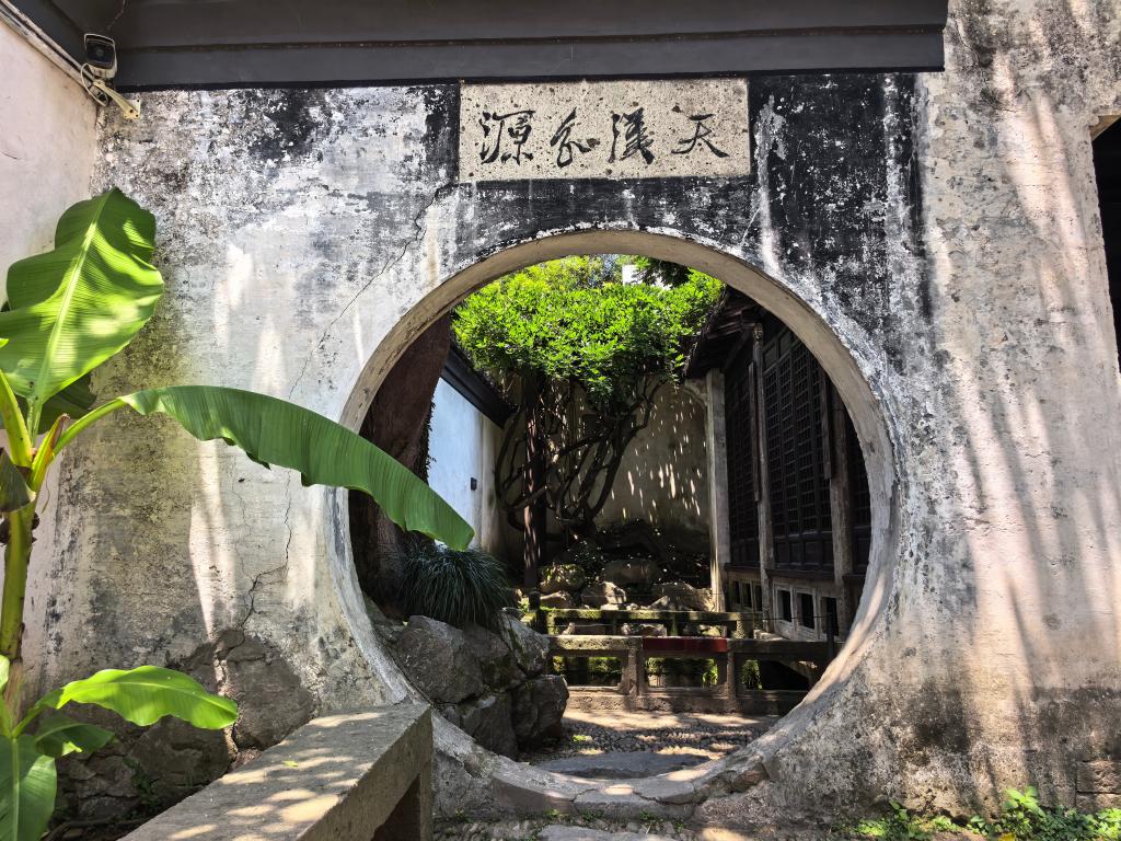 月門上書有“天漢分源”四個大字,此為徐渭之手跡。相傳徐渭認為天池之水乃是銀河流落人間的一股源泉,故而題寫此四字。進入月門,靠左邊的冬青樹,已有200余年樹齡,可以說是見證了書屋的數易其主、滄桑變遷。天池為七尺見方的石砌小池,徐渭稱此池“通泉,深不可測,水旱不涸,若有神異”,故取名“天池”,并以此作為自己的號。