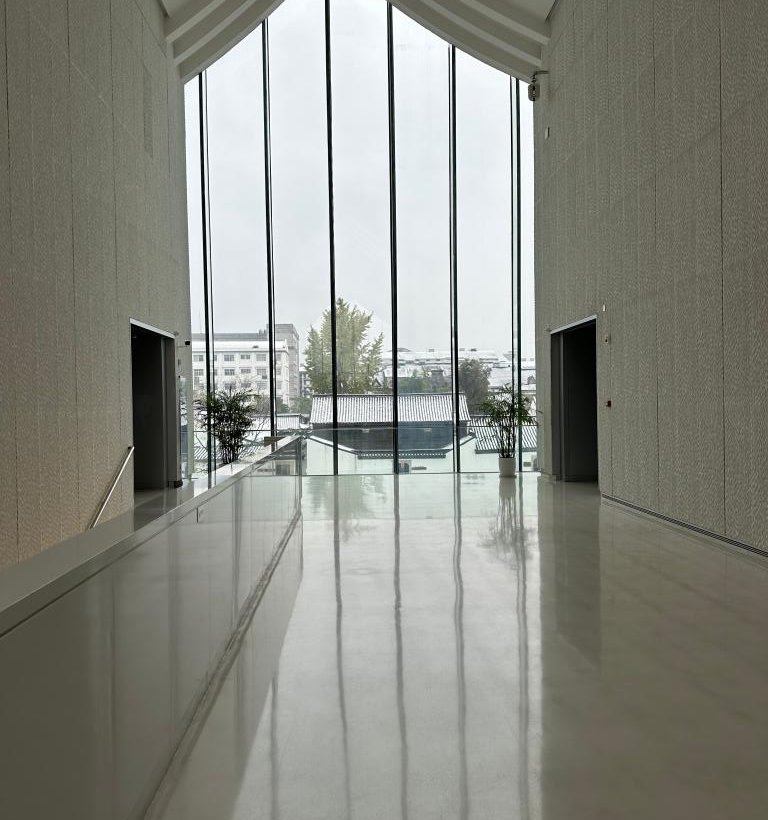 徐渭藝術館二樓的大面玻璃墻簡約而富有格調,呈尖頂形態,將室外建筑、樹木與天光引入室內,營造出通透、靜謐且融合自然與建筑美學的氛圍。