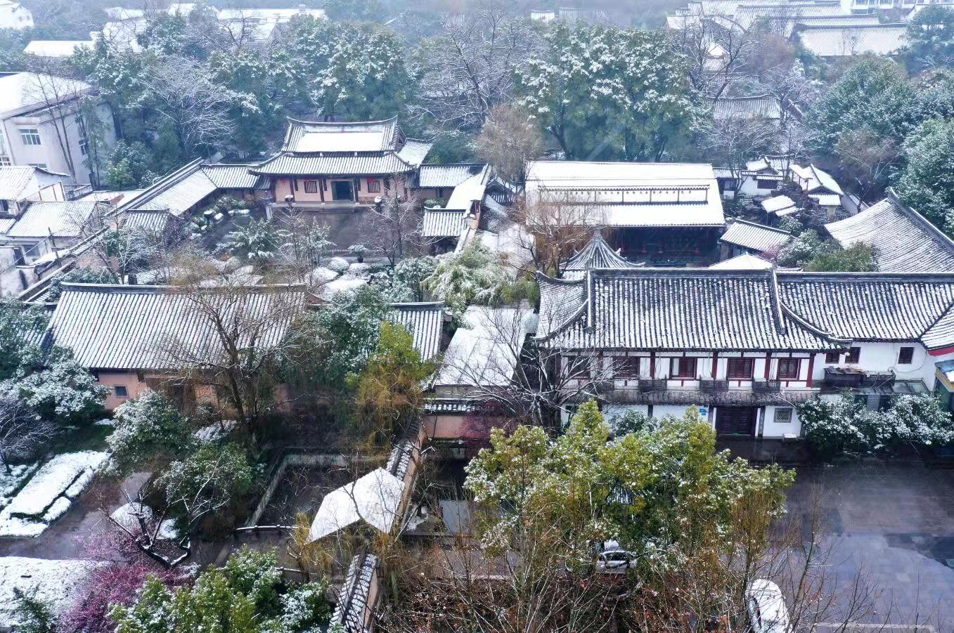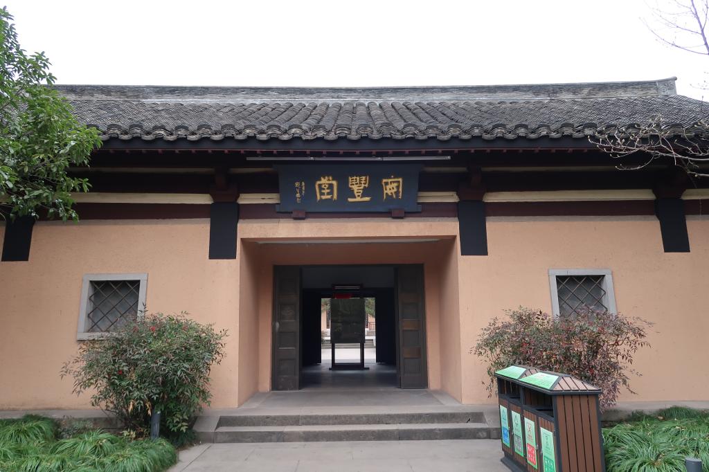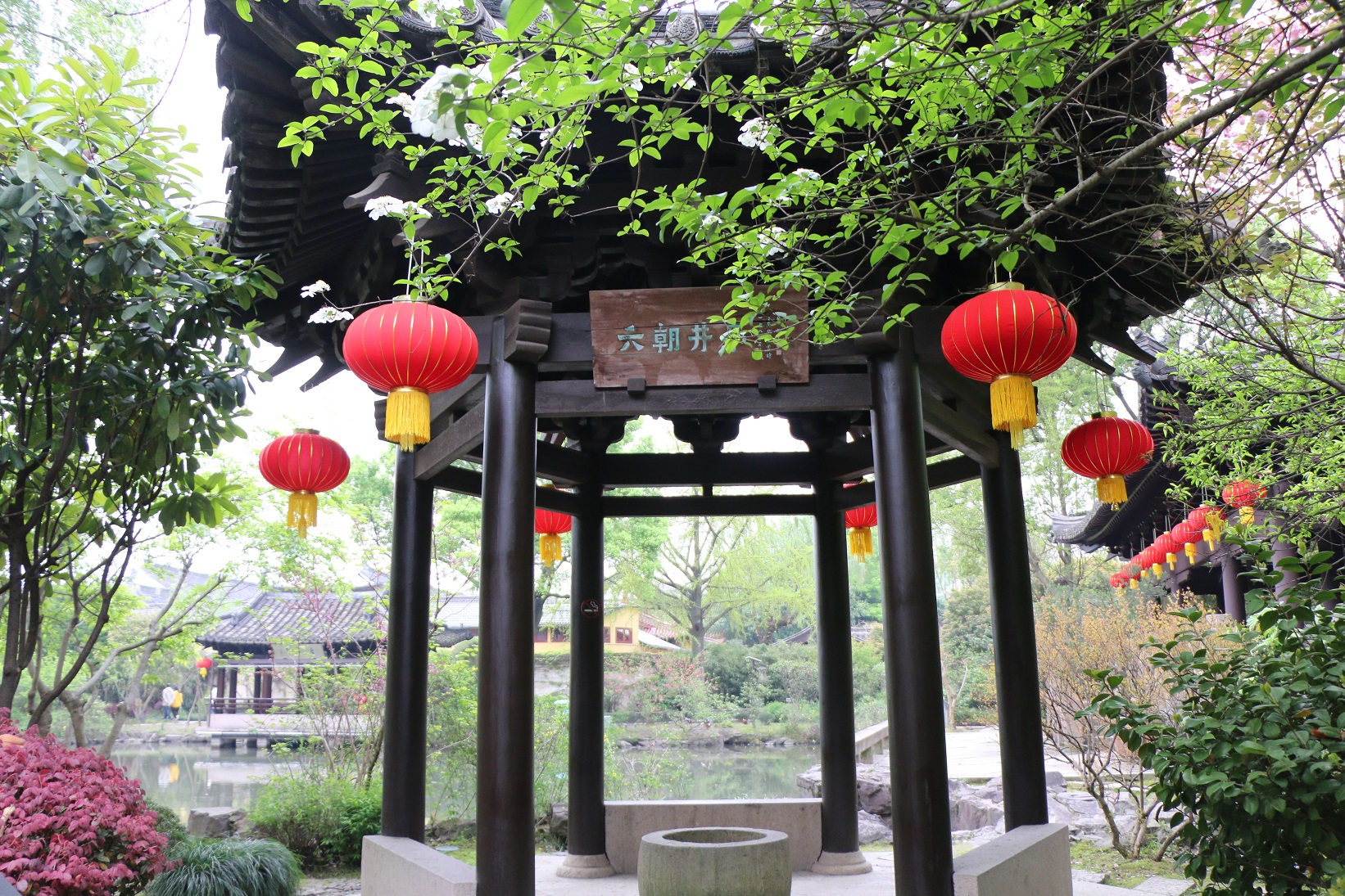 六朝井亭是唐、五代、宋、明、清的亭閣、磚井、池塘和假山等建筑遺址多處,是沈園悠久歷史的實物見證。“六朝井亭”亭內有古井一口,此井亭中間可以望到天空,亭頂中空,可以使井承天露,象征詩人覆水欲收的意愿。中空“承天光”,解決雨水活性和采光。使人們從中體現向往婚姻光明自由的愿望