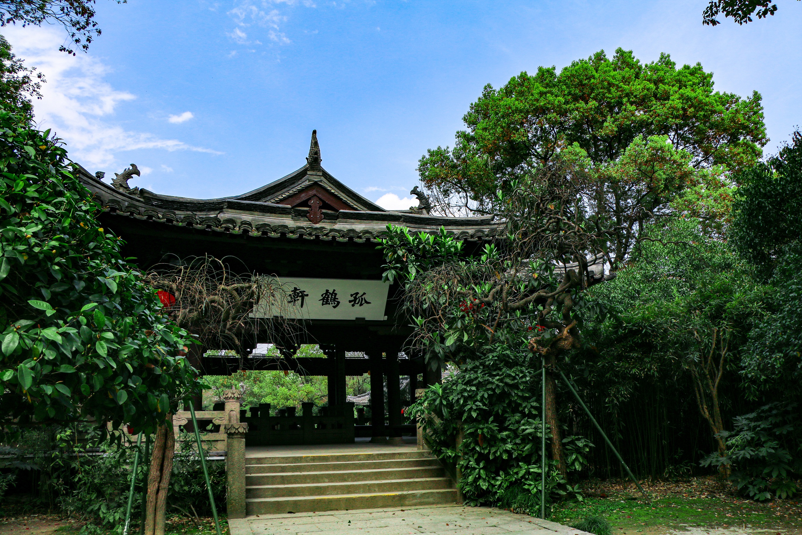 孤鶴軒亦稱“孤鶴哀鳴”處,是陸放翁的自喻。偉大愛國詩人陸游因南宋朝廷昏庸,壯志難以實現,發出孤鶴的哀鳴,以孤鶴自喻,隱喻詩人在人生中痛失伴侶,事業上報國無門、愛民有罪、屢遭貶職的坎坷一生。亭內有“亭池”遺址,1985年考古發掘時在此發現唐亭閣和明代的假山、魚池遺址。“孤鶴軒”匾額分為內外兩塊,內匾額由著名書畫家、文物鑒定家謝稚柳題寫,亭外由大康敬書
