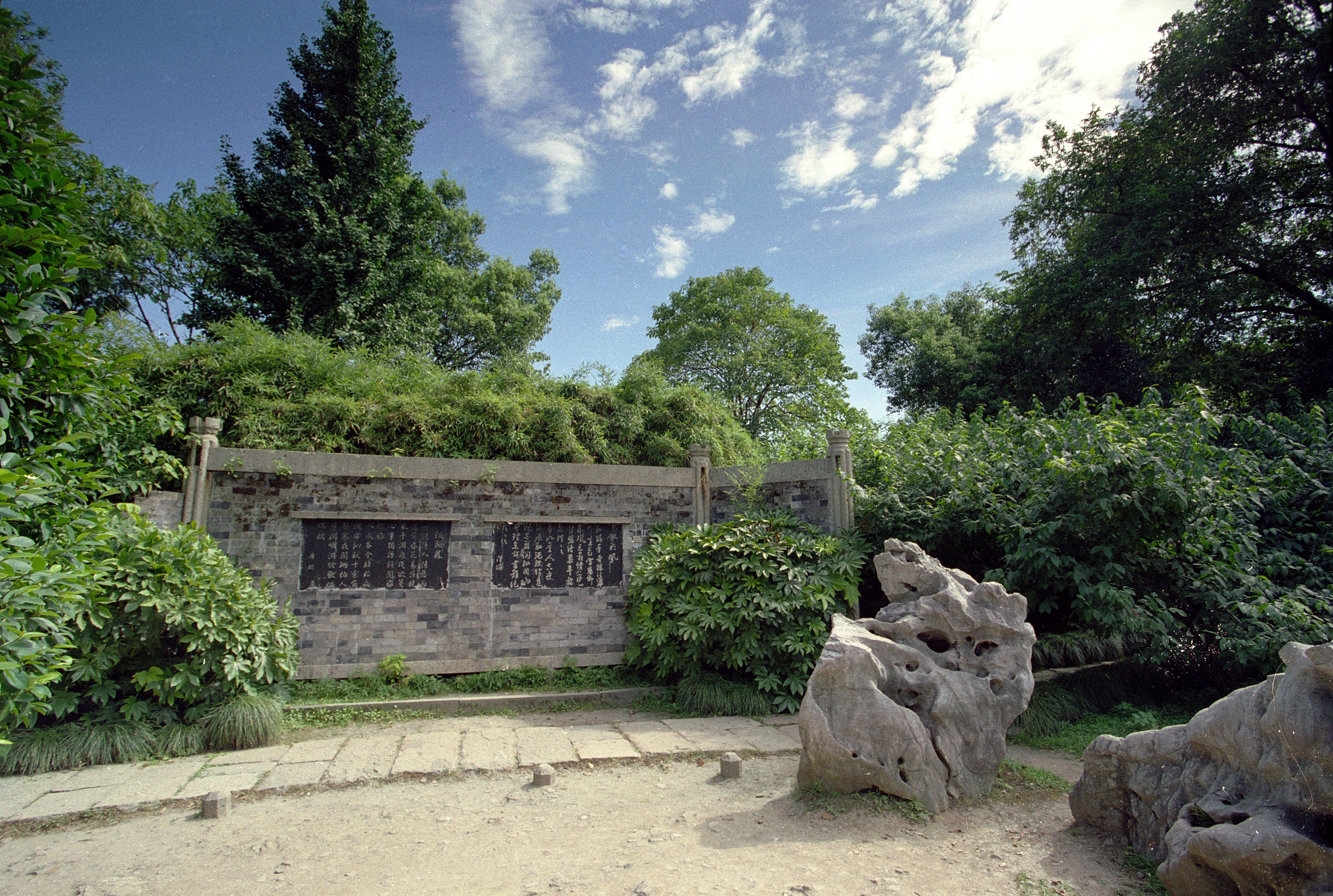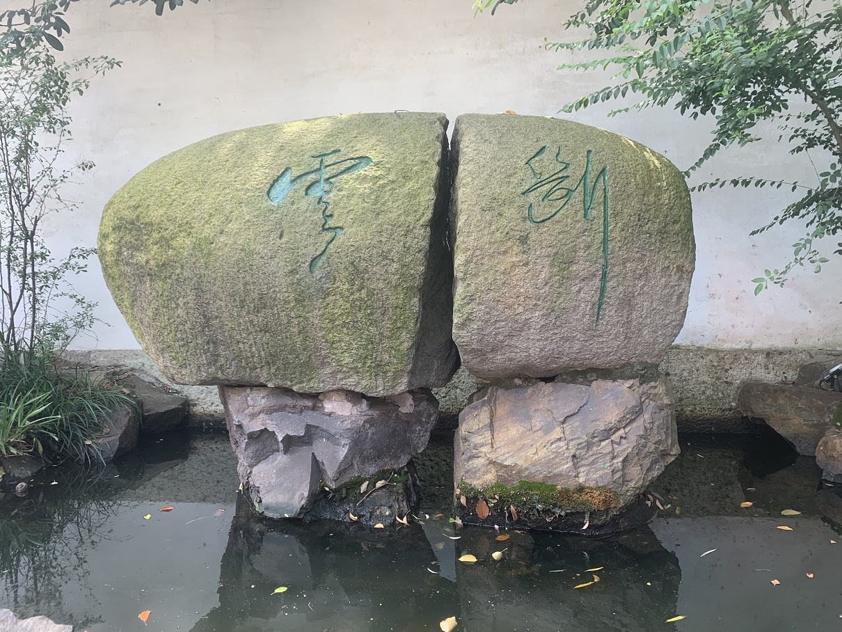 斷云石在沈園入口處,陸游曾寫過詩句“斷云幽夢事茫茫”,“斷云”諧音“斷緣”,此石中間斷開,但依依不愿分離,向人們訴說陸游和唐琬的愛情悲劇,點明沈園的主題