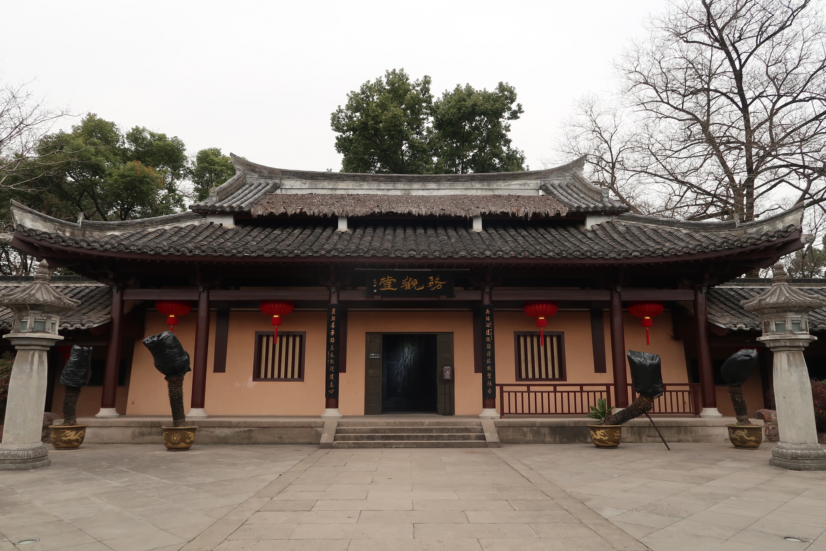 陸游紀念館展廳由兩進建筑組成,第二進展廳為“務觀堂”,名取自于陸游的字。務觀堂內展出陸游詩詞手跡等碑牘以及陸游兒子墓志銘碑,還有沈園全景模型和陸游三山故居模型。第一進展廳為“安豐堂”,名取自于陸游詩句“安豐年而憂歉歲”,表示詩人與民共疾苦的情懷。安豐堂布置《陸游史跡陳列》,陳列分愛國壯志、愛鄉赤子、愛情悲歌三大部分,通過對這三個主題的展開,全面闡述陸游的生平事跡。務觀堂安豐