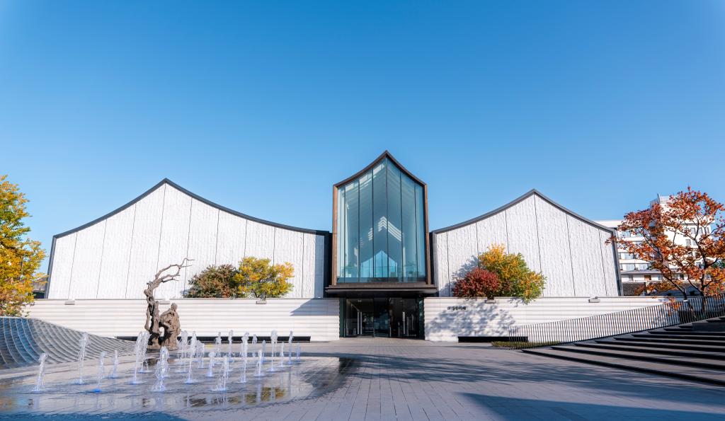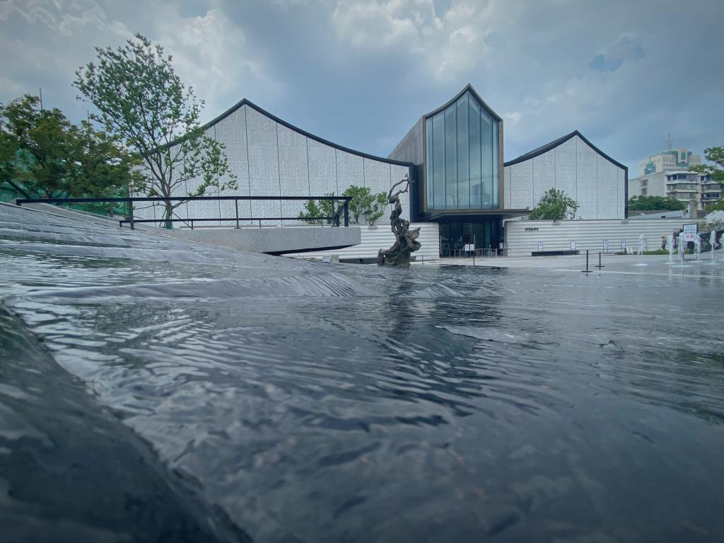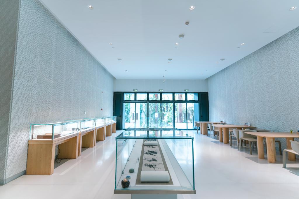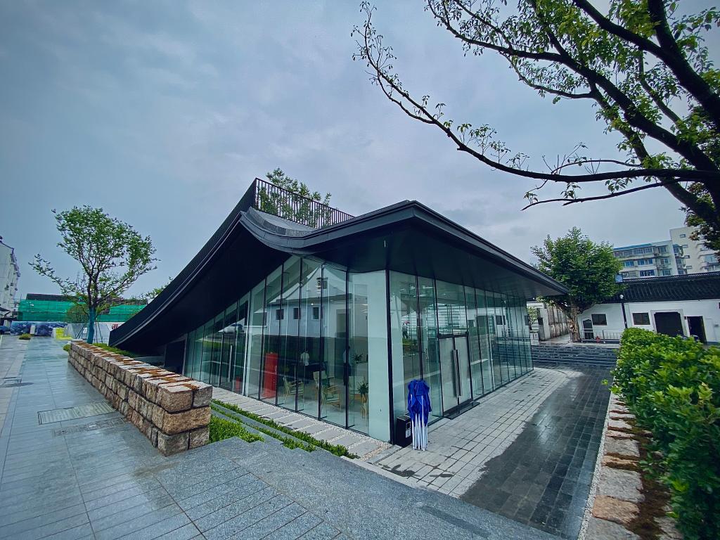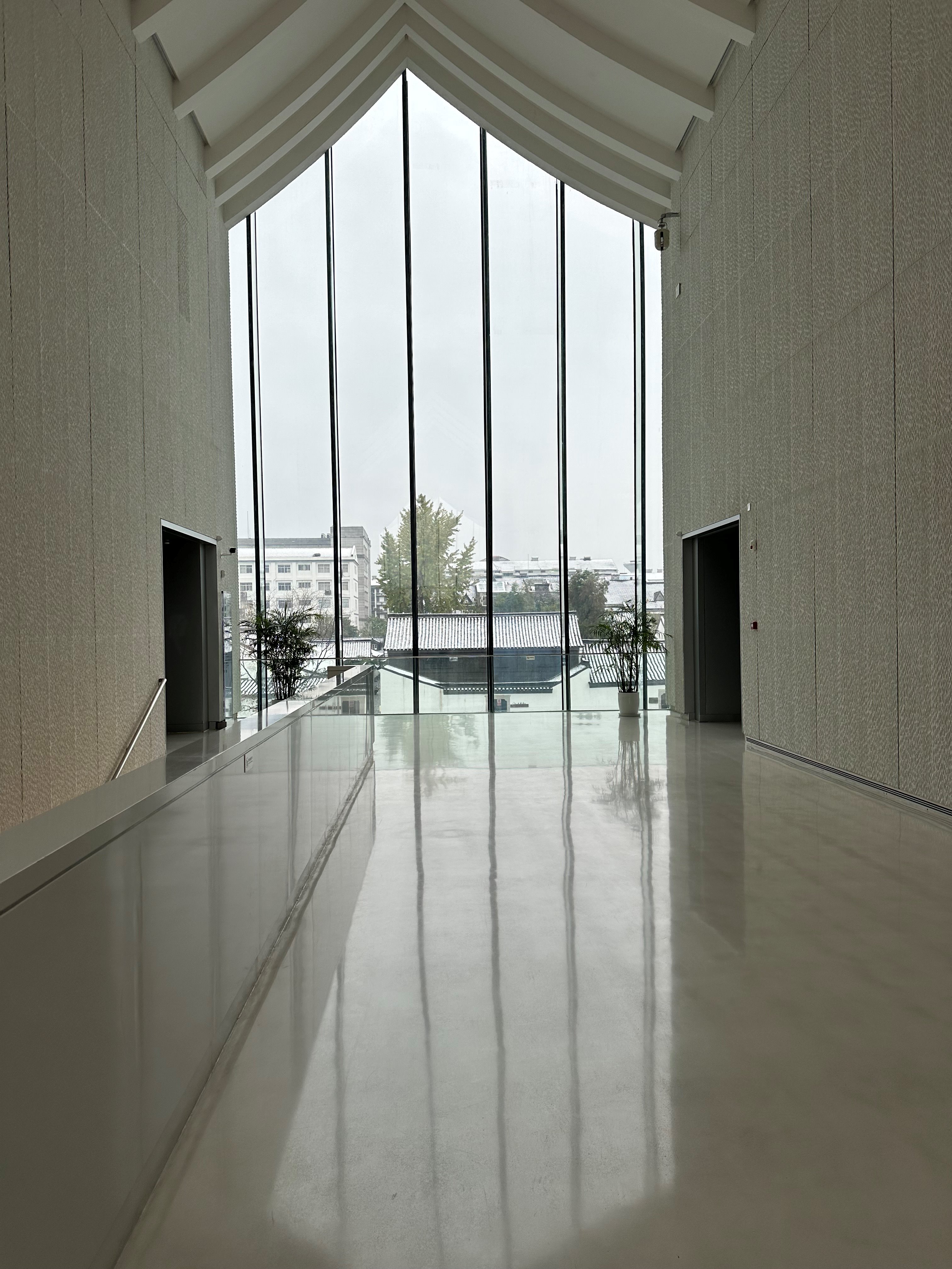 徐渭藝術館二樓的大面玻璃墻簡約而富有格調,呈尖頂形態,將室外建筑、樹木與天光引入室內,營造出通透、靜謐且融合自然與建筑美學的氛圍