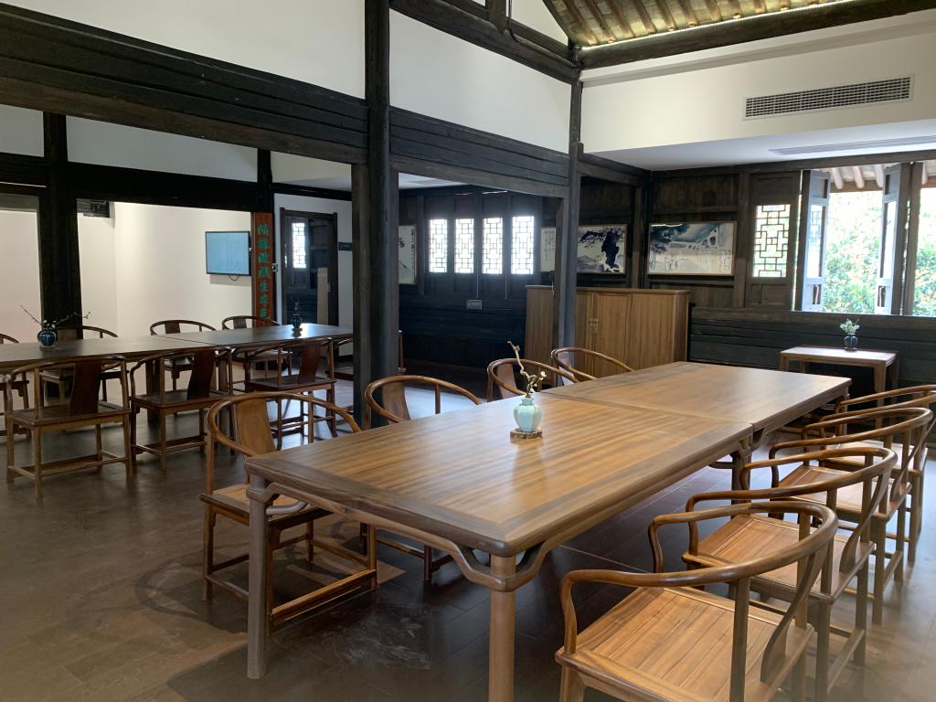 臺門二樓為開放式的茶室空間,北鄰青藤書屋,臨窗觀望古宅一覽無余,室內環境清幽,家具古樸,可供游客或團隊舉辦活動或雅集。館區會在特定的時間開展非遺老師講故事、研學游等各種活動