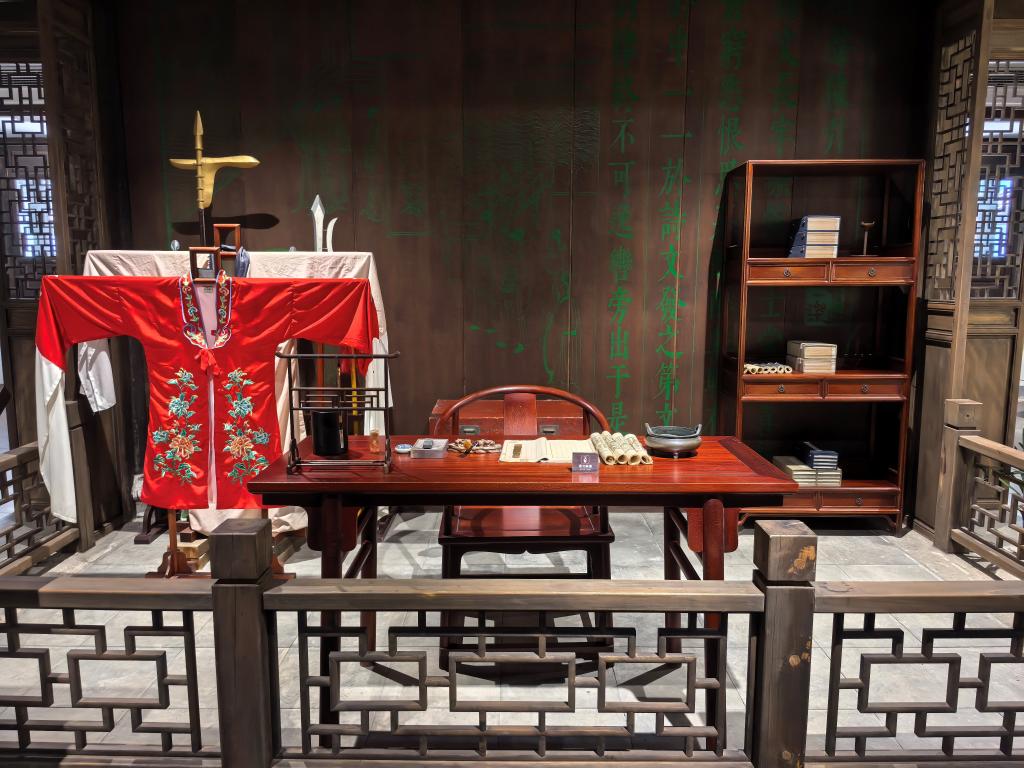 展廳模擬徐渭創作戲本所用的書房一景,旁置明代風格形制的戲服,生動還原當時的場景。徐渭自稱“南腔北調人”,他在戲曲上的成就非常突出,創作了不拘一格、抒懷寫憤的雜劇《四聲猿》,掀起了明中后期雜劇創作的高潮;研究“士夫罕有留意”的宋元南戲,留下了中國古代戲曲史上唯一的一部南戲概括性著作《南詞敘錄》