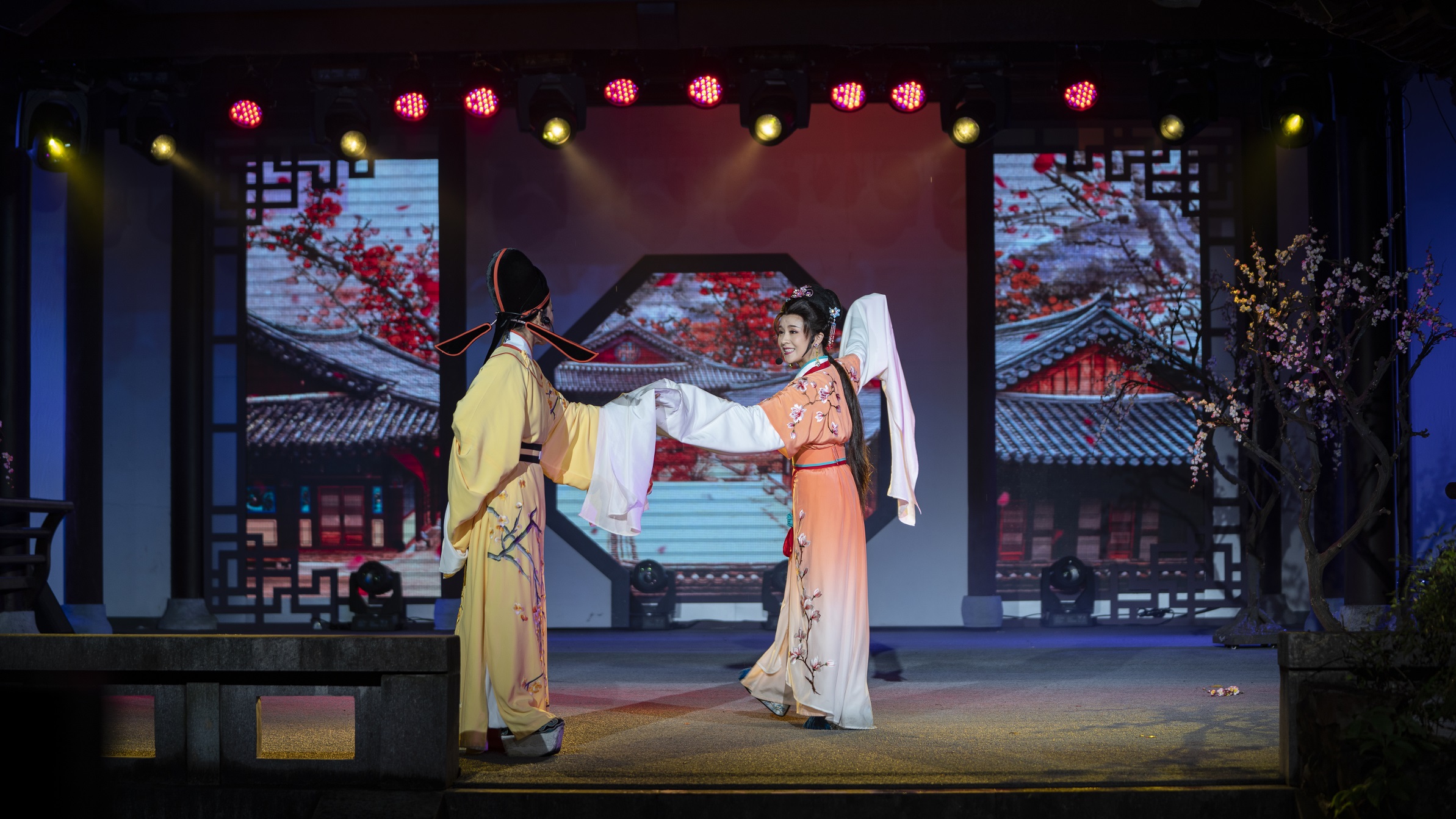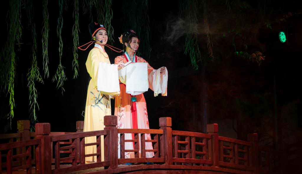 沈園之夜”堂會演出是沈園最具特色的夜游項目,自 2008 年推出以來,多次改版升級。2018 年中秋前夕,全新改版的“沈園之夜”堂會亮相,演出時長約 50 分鐘,由國家一級導演陳偉龍擔任導演、國家一級編劇錢勇擔任編劇、國家一級導演汪嘉寶擔任作曲、編曲,分為“開園”、“游園”、“別園”、“歸園”、“題園”、“惜園”六大版塊,節目均為原創作品,表演的元素相對集中,緊緊圍繞陸游、唐琬愛情故事展開,從陸游與唐琬游園時的纏綿情意,到在沈園再見面時的情恨綿綿,從陸游歸園時提筆在沈園寫下《釵頭鳳》,到白頭不堪回首的場景,陸游與唐琬的故事曲折、纏綿悱惻、凄美動人。