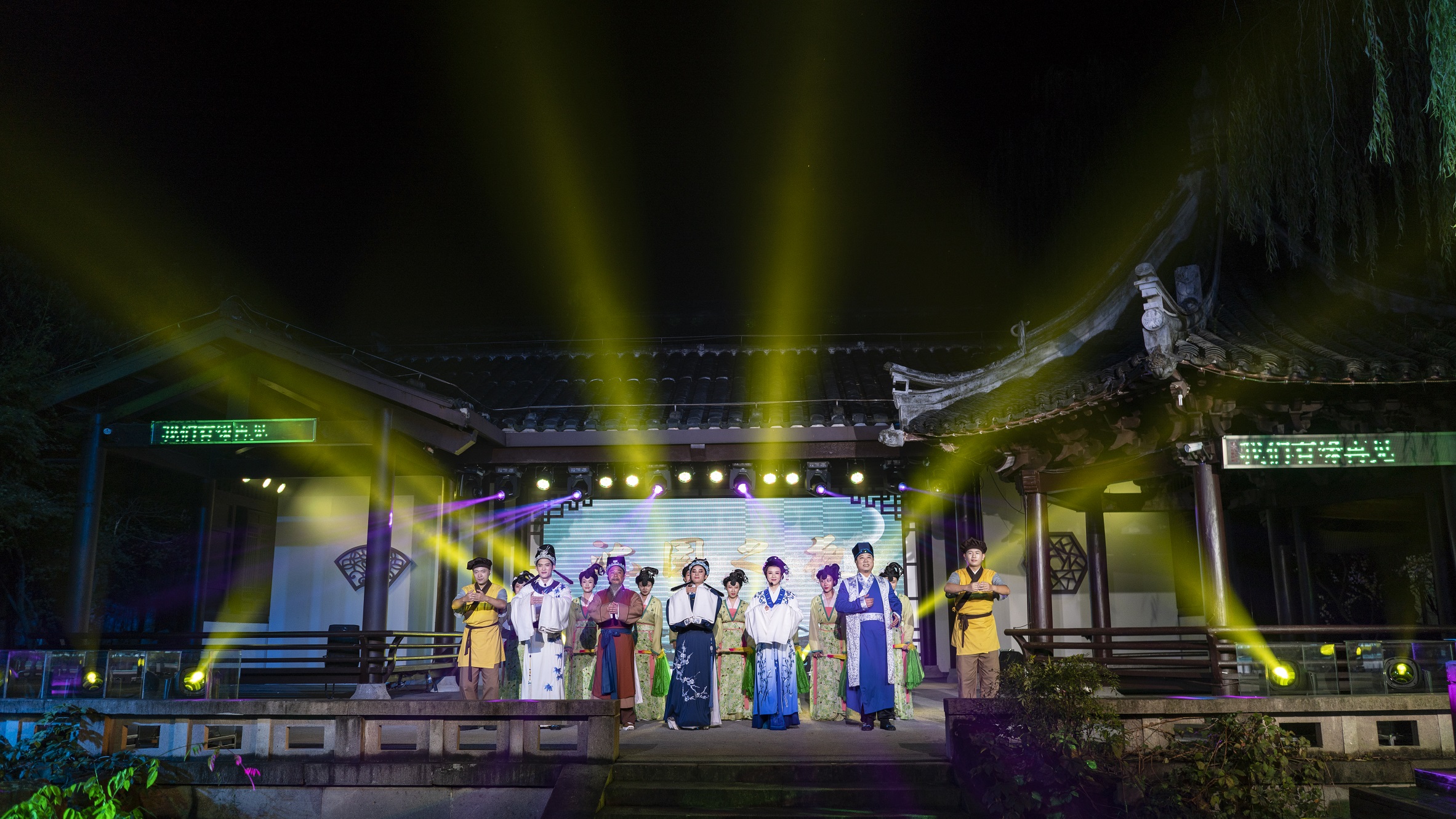 50 分鐘演出時間,讓人看得明白,也讓人理解更深刻,升華了愛情主題。新版《沈園之夜》還提升整體的表演品質,增加了燈光、舞美、視頻,內涵豐富,觀賞的層次提升。在音樂上,新版《沈園之夜》有了全新面貌,紹興戲曲元素豐富,吸收了紹興曲藝,也吸收了現代音樂手段,如合唱、交響樂等,氣勢雄偉,給人全新感覺。 新版《沈園之夜》是一臺園林實景演出,越劇、蓮花落、紹劇、鸚哥調等多種音樂元素,使優美的愛情故事更加動人,整臺演出婉約而又磅礴大氣,纏綿而不喪氣、低沉。現場表演在沈園橋間廊邊進行,加上水鄉風景的配置和屏上互動,引導觀眾走入一闋優美的《釵頭鳳》中,讓人感到整臺戲曲子美、意境美。<